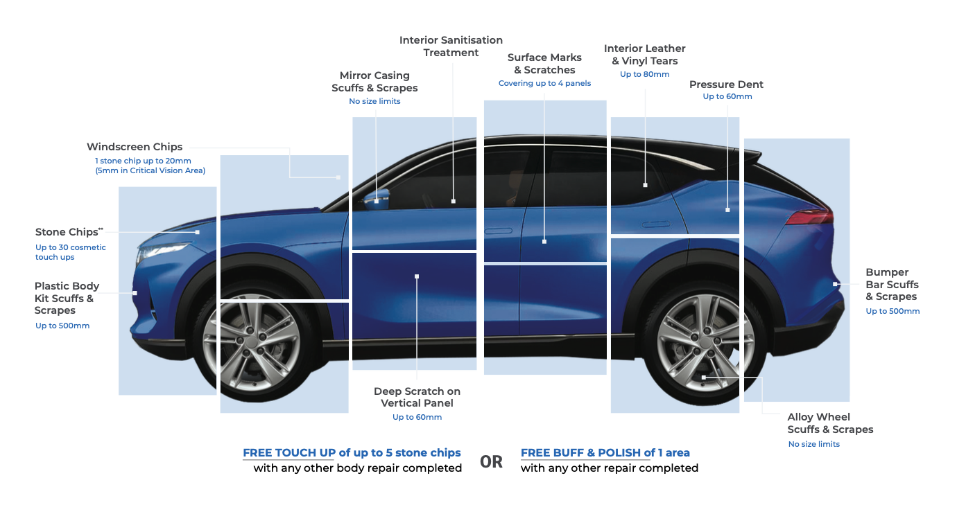Drive with peace of mind knowing that unforeseen minor cosmetic scratches, dents and scuffs caused by everyday travel can now be repaired at your convenience.