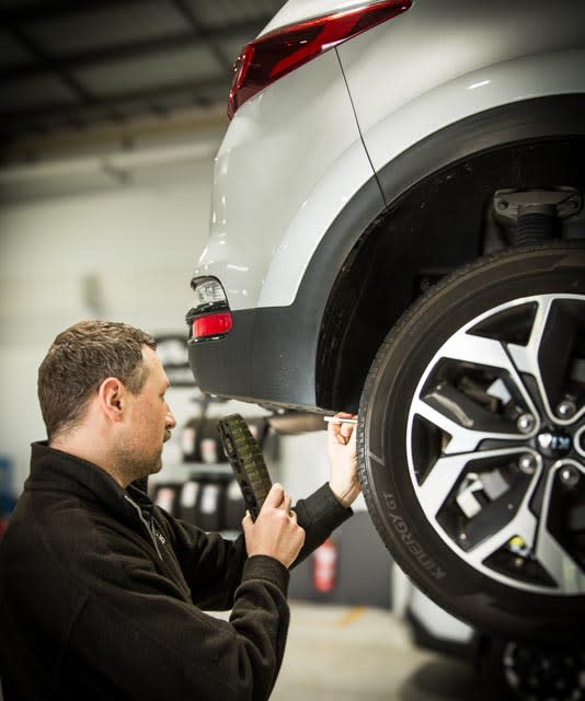 Check and report on tyre condition, correct size and load rating including wear estimate.